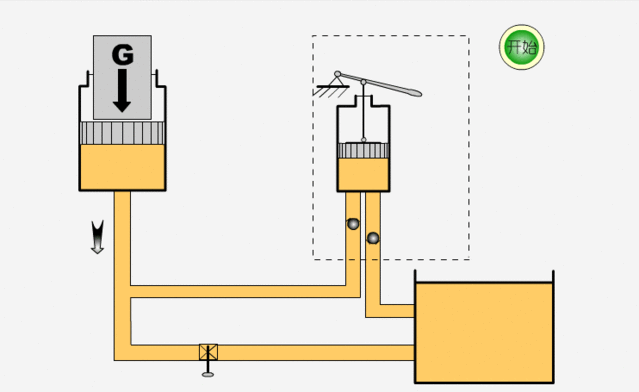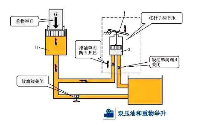 手動(dòng)液壓車液壓系統(tǒng)杠桿手柄向下壓,將重物托起。