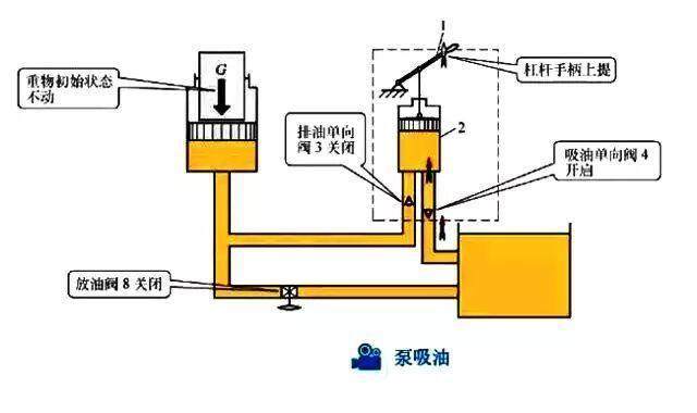 手動(dòng)液壓車液壓系統(tǒng)杠桿手柄向上提,小活塞吸油。