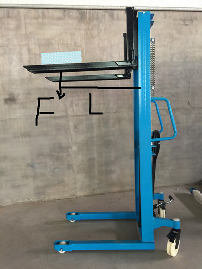 上圖可見,液壓手動堆高車廠家建議堆高車產(chǎn)品作業(yè)根據(jù)物理公式F總=F質(zhì)量X L力臂X cos角度