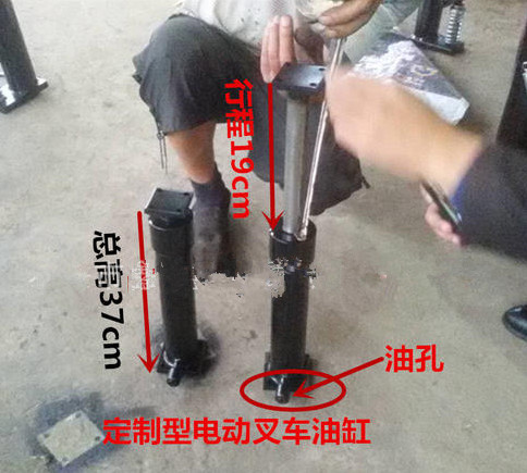 1噸液壓堆高車液壓缸總高度為37cm,活塞桿行程為19cm。